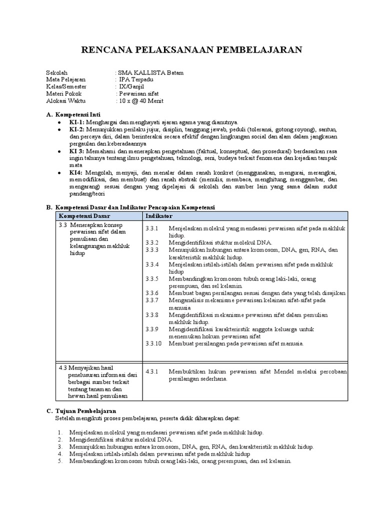 PDF) RPP K13 IX Pewarisan Sifat pada Makhluk Hidup | Koko Budi …