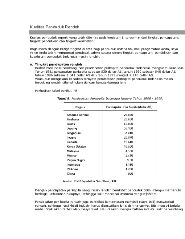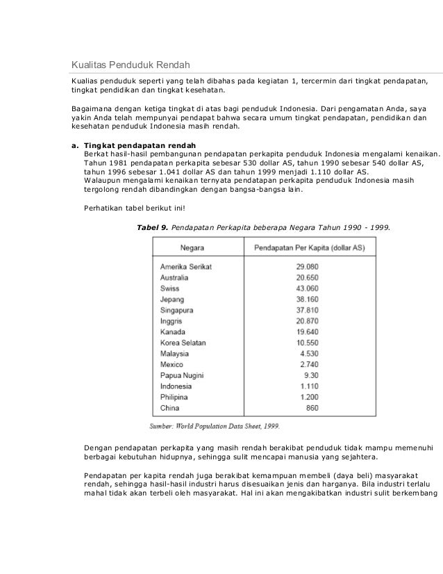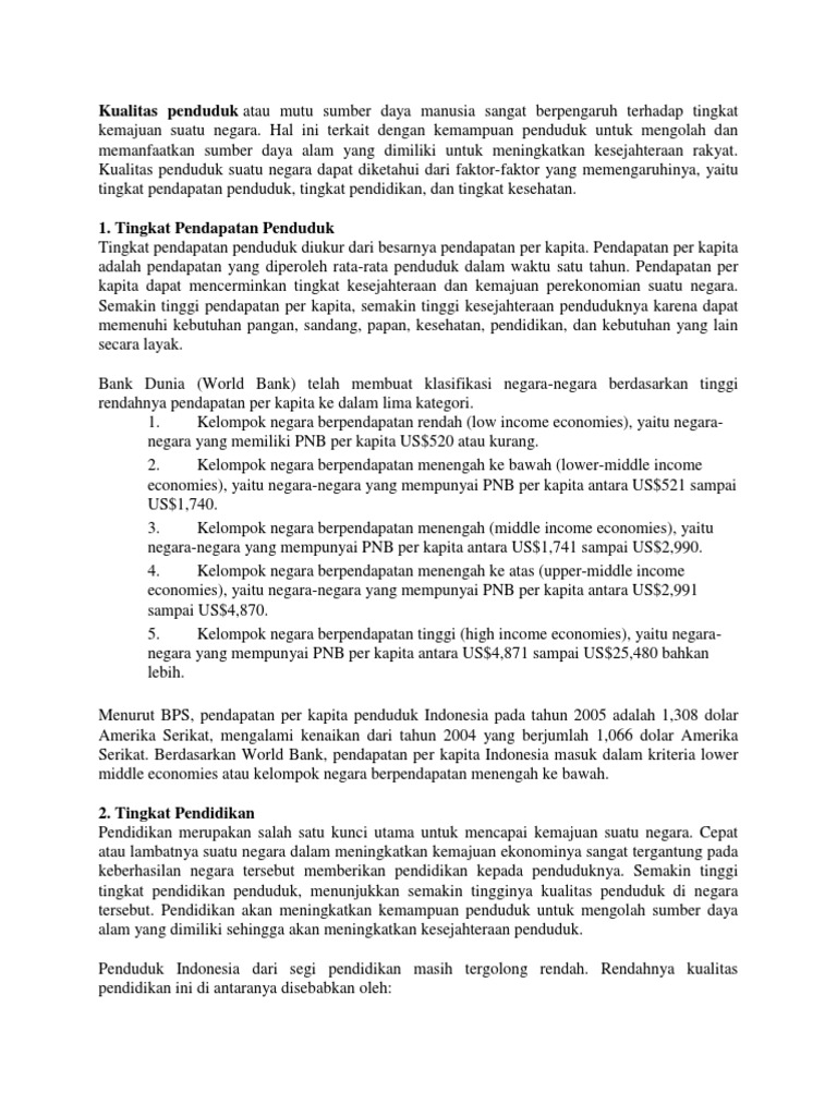 Kualitas penduduk atau mutu sumber daya manusia sangat berpengaruh terhadap tingkat