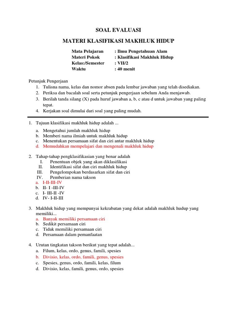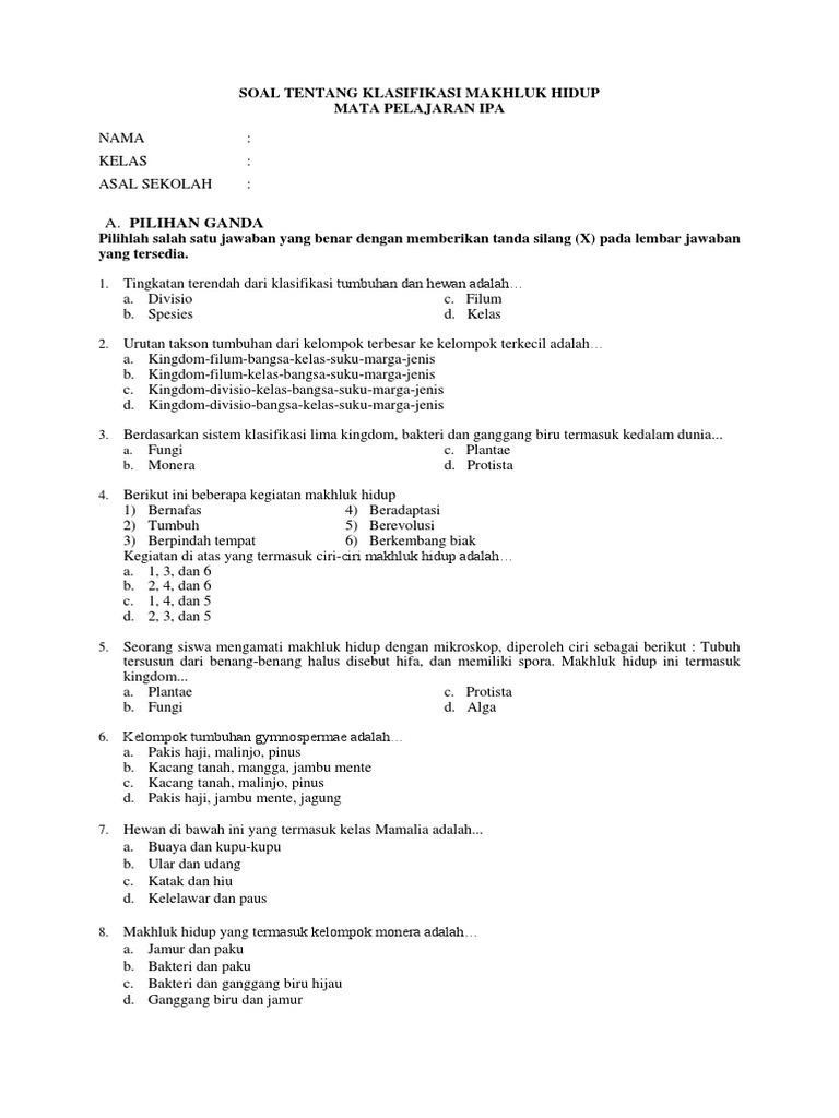 Contoh Soal Klasifikasi Makhluk Hidup Kelas 7 Pdf - Dapatkan Contoh