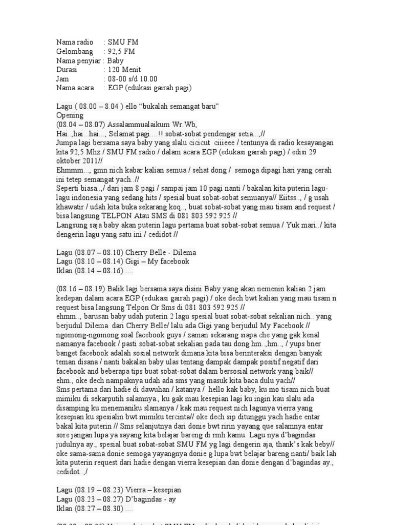 DOC) CONTOH NASKAH PENYIAR RADIO | yulia fida - Academia.edu