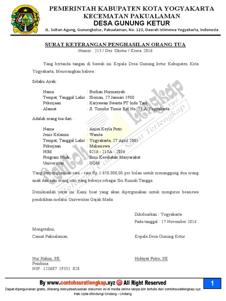 Contoh Surat Keterangan Penghasilan Orang Tua – Nguliah.com